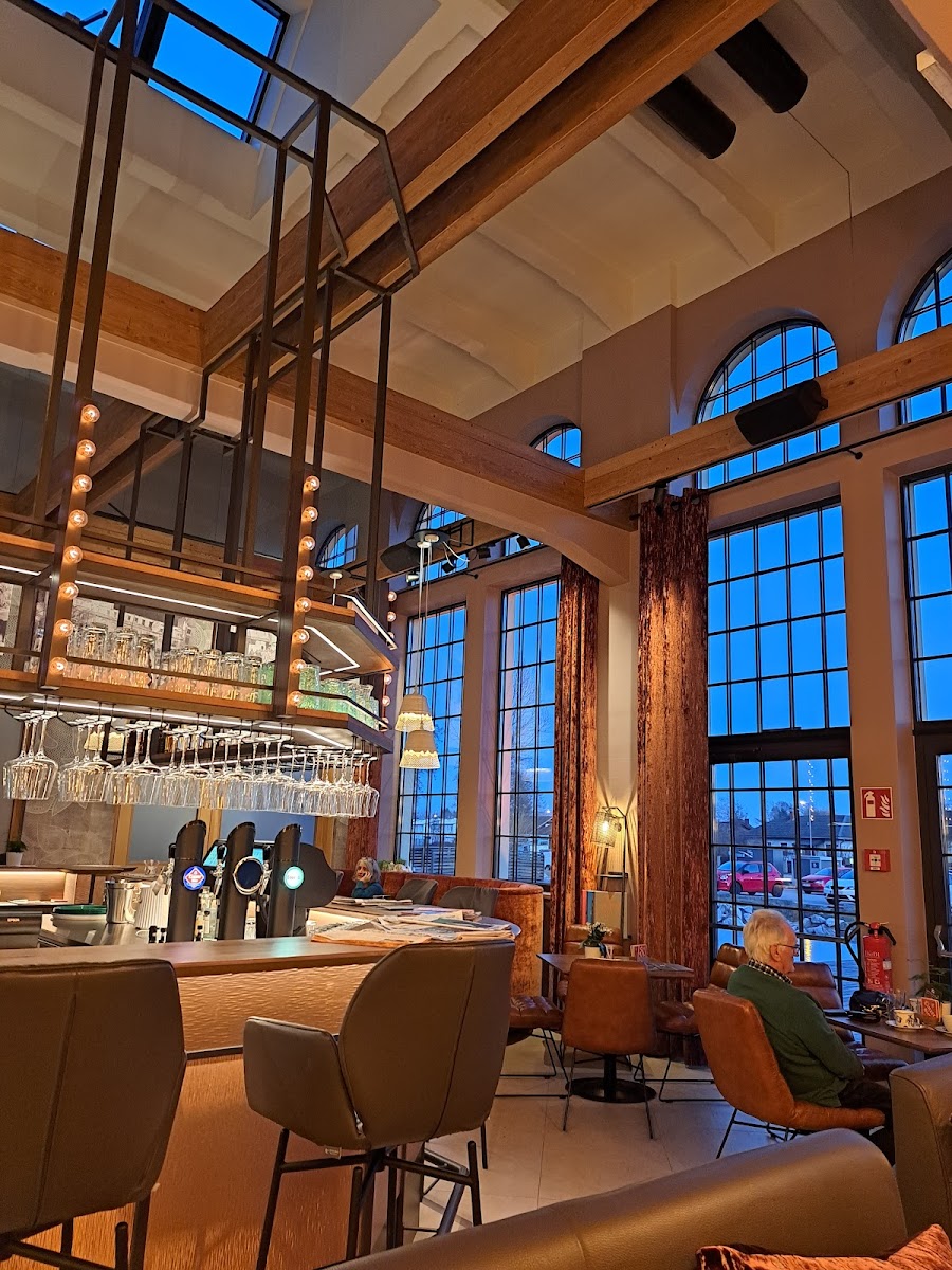Step inside and be captivated by its extraordinary ambiance, housed in a refurbished factory building that effortlessly blends rustic charm with modern elegance. The café’s spacious layout includes a magnificent terrace overlooking a serene Koiteich, allowing you to enjoy your meal surrounded by nature's beauty—a true escape right in the city center.